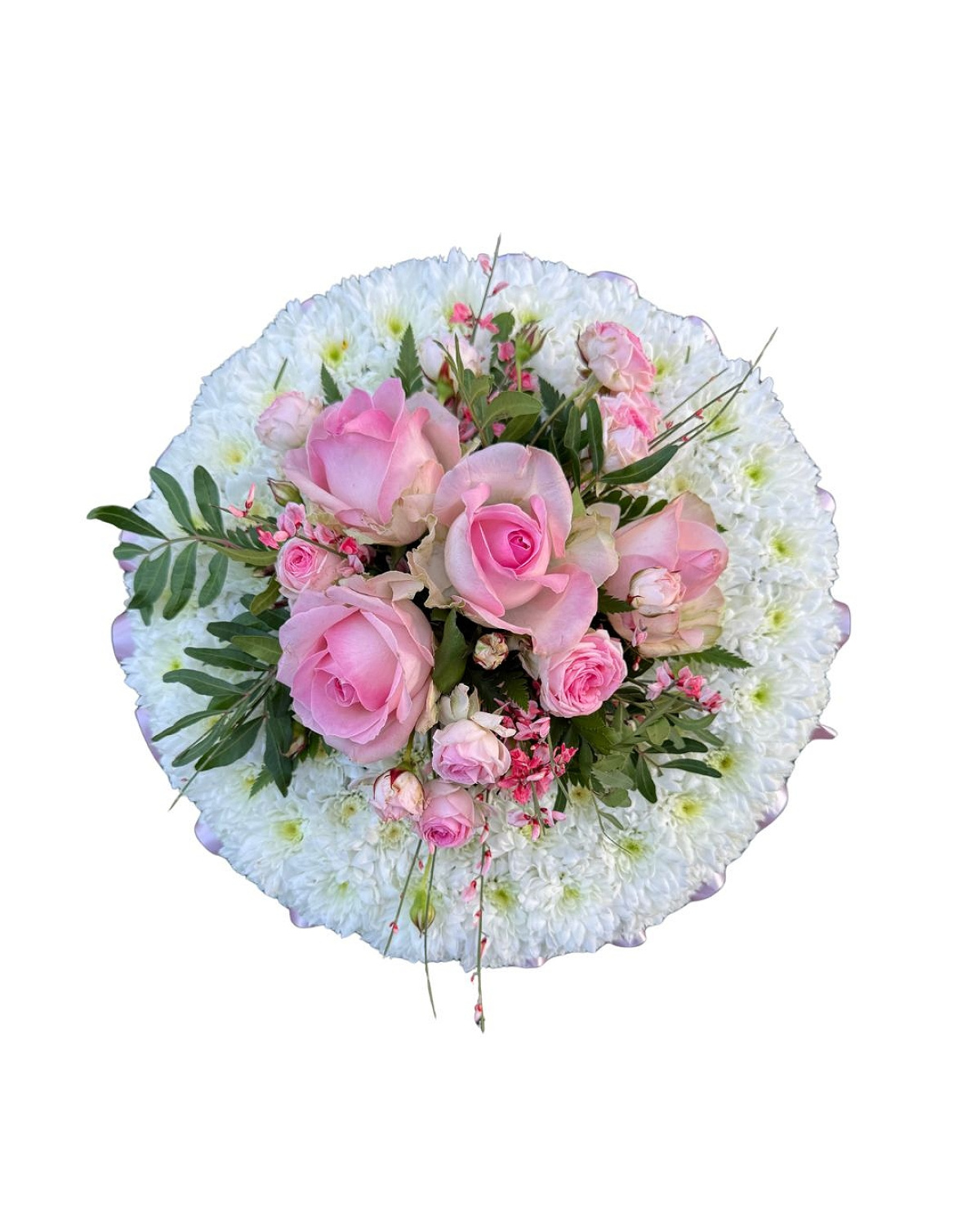 Based in white chrysanthemums posy pad traditional style ribbon edge with matching spray